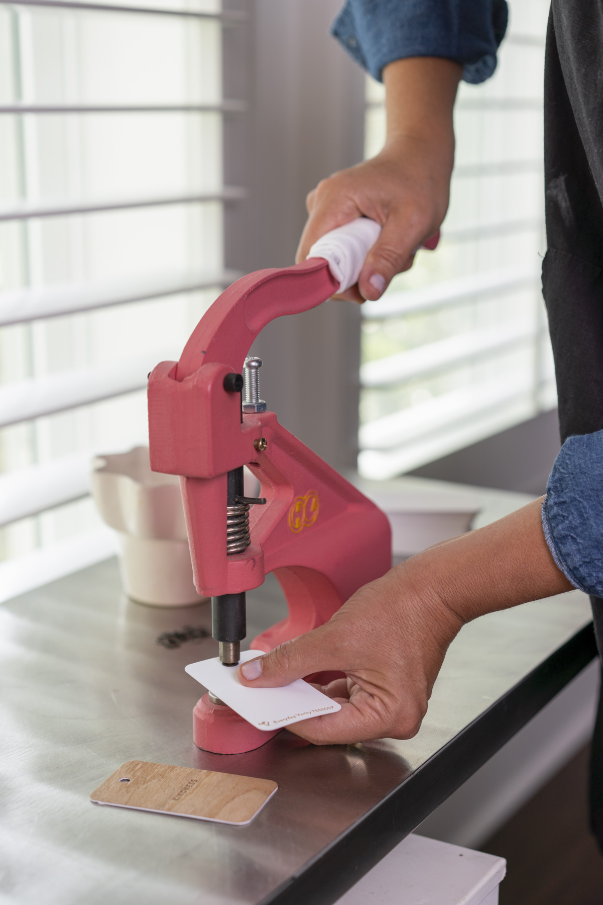 Once she was camera-ready, we moved on to portraits in the studio, followed by process shots. We showed Amy printing at her 750-lb press, mixing ink, stamping grommets into gift tags, designing at her computer, and using her die-cutter. Process shots are always a favorite of mine. They’re versatile and allow for a mix of wide shots and close details.